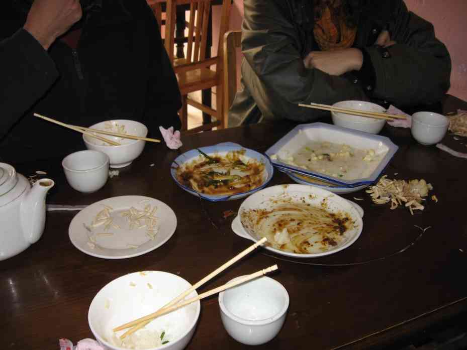 Oko podne sam pošao sa Raquel i Alfonsom da probamo da nađemo neku agenciju u kojoj bismo rezervisali karte za voz za naše planirano putovanje. u najavi znamo da će biti veliki problem, jer pre praznika svi Kinezi putuju svojim kućama i teško je naći karte. Nekoliko agencija je bilo zatvoreno, neke prodaju samo za avion, tako da smo odlučili da se prošetamo do jezera, jer je vreme bilo toplo i nije duvao vetar kao juče. Iznad jezere imaju neku špicastu pagodu, a iznad nje neke stene na koje se može popeti i gledati skoro celo jezero, sa okolnim planinama. Sve bi to bilo mnogo lepše da zbog smoga planine ne izgledaju sive. Sada vidim koliki je ovaj grad. OGROMAN. oko 6 miliona ljudi, ogroman centar grada, zgradetine na sve strane (inače, Kineski oblakoderi su kičasti, često zlatni, srebrni, sa nekim ornamentima, i sve je strogo simetrično, tako da najčešće nisu baš interesantni). Na ćošku, blizu stana, imamo ekstra fast-foof. Za 9 dinara dobiješ 2 ili 3 knedle punjene mesom, i malo propržene. Za 18 se dobije kajgana, ili neka pita sa povrćem i začinima ili neka tortilja filovana povrćem.... sve u svemu, ubuduće ću ovde kupovati doručak, jer je mnogo bolji nego u firmi, a i jeftiniji. Večerali smo u, već čuvenom, ćumezu, već čuvenu, piletinu i patlidžan. Sada sam se već navikao na štapiće i sve manje hrane mi ispada po stolu, mada ovde i inače Kinezi svako đubre ostave na stolu, salveta - ništa. Da smo se asimilovali, pokazuje sledeća slika krtoga koji smo ostavili posle večere.