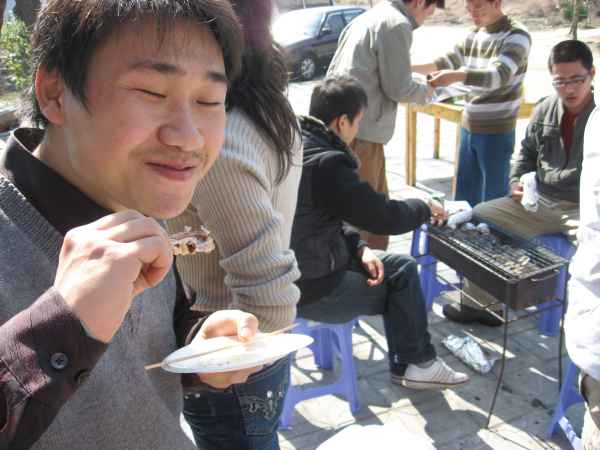 Oko deset, Katia, iako je sitne građe, lupa na vrata toliko jako, da nije bilo šanse da se ne probudim. Dole nas je čekao Uan Đin Đan, to je onaj mali Kinez što smo ga "učili" kako da igra, pa je bio smešan ko crtani film. Nakupili neko povrće i neko meso.... meso, pa gde su bre ćevapi? Gde je bre pljeskavica? A roštiljske kobasice?? Pa šta je ovo? Ubeđuju me da je sitno iseckana svinjetina fina na roštilju (u šta ne sumnjam), ali još da je zaliju medom!? Pa neke kobasice, a ono slatke, ko bombone! Dobro... ješću tu svinjetinu (bez meda), pečurke i još neko povrće. Natrpali smo se u neki kombi koji nas je odvezao malo dalje, van grada. Tamo imaju neki "poligon" za roštilj. Plaća se najam roštilja, ali oni sve regulišu - ugalj, vatru, vodu, escajg. Kada treba, samo vikneš i oni ti donesu još uglja, već pripremljenog. Samo još da ima pljeskavica....