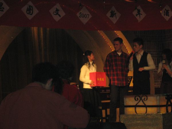 E sada počinje.... dolaze ponovo ti ljudi, domaćini, i nešto pričaju sa Lo Đin. Ona mi kaže da oni žele da BAŠ JA izađem na binu, kada izgovore moje ime ("bosko", nema "š") i da izvučem neki papir... neka nagradna igra. Mala digresija.... ovi kinezi bacaju vatromet i u pola11 prepodne. Prozovu oni mene, ja se osećam kao budala. Lo Đin i Alfonso me ubeđuju da je to sve normalno i da ne trebam da izgledam zbunjeno, nego da glumim nešto u fazonu "meni je sve ovo bezveze, ja sam suviše dobar za ovakve proslave". I tako, popnem se ja tamo, oni Kinezi polu-pijani gledaju me kao da u životu nisu videli tako nešto... neki voditelj pita me da li pričam kineski. Ja zaboravim sve što sam znao (tada se to manje-više svodilo na rečenicu "ništa nije nemoguće" i "vredno radi i napreduj svaki dan", bilo bi možda dobro da sam im to kazao). Izvučem taj papirić, ovaj voditelj nešto priča na kineskom, ovi se "gosti" smeju kao mala deca. Kontam da sam ja bio povod za smejanje. Pitam posle ove moje... kažu mi da se pominjao neki King Kong. Nisam se raspitivao dalje od toga. Onda su mi lepo objasnili da je to ovde sasvim normalna stvar i da se dešava da u klubu dobijemo turu pića ili neku večeru, samo zato što nismo žuti. Takav je ovde biznis!