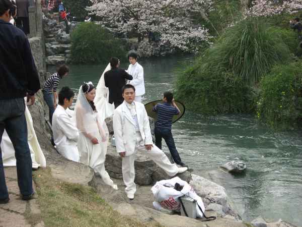 Ovog vikenda smo se bili dogovorili da pre časova neko vreme pikamo odbojku ili nešto slično. Pošto smo zakasnili, već je bilo vreme za ručak (od našeg stana do univerziteta menjamo dva autobusa i sve zajedno treba oko sat i četvrt). Onda su devojke predložile da odemo do jezera i tamo pikamo nešto sa loptom, a da posle u nekom McDonaldsu ili KFCu imamo čas. Da... najbitnija stvar je da je ovo BESPLATNO, tj. one to rade jer im je zanimljivo. Naravno, odužićemo im se nekim "prigodnim" poklonom na kraju. I tako smo seli u neki taksi, jer bi autobusom trebalo više od sat vremena. Ispostavilo se da ceo Hangdžou nedelju popodne (naročito ako je lepo vreme i kada cele prethodne nedelje pada kiša) provodi u JEDNOM parku pored jezera. Imaju toliko neverovatno uređenih i picnutih parkova, šetališta, staza... a oni svi nagrnuli u jedan isti. Nama je trebao baš ovaj jer tu imaju velike livade koje su dobre za planirane sportske aktivnosti. Mi došli tamo... a ono... na ulazu gužva kao pre deset godina u redu za ulje i šećer. Naravno, od odbojke ili nečeg sličnog nije bilo ništa jer nisi mogao da se pomeriš nigde od gužve. Tu sam video jedno 50ak parova koji poziraju pored nekog cveća i slikaju se. Ovde je običaj da mladenci pre (ili neposredno posle venčanjka, nisam siguran) naprave jednu fensi sliku. To su neke poze, najčešće pored neke vode ili pored nekog rascvetalog žbunja i drveća, pa se sve to posle ispegla u Photoshopu i eto uspomene za ceo život! Meni je ovo bilo malo smešno... vidiš među gomilom ljudi, koji se šetaju parkom, parove koji čekaju na red kod fotografa pored nekog potoka, pa onda 10m dalje kod nekog cveća, pa 20m dalje kod nekog drveta, itd. Evo kako to izgleda...