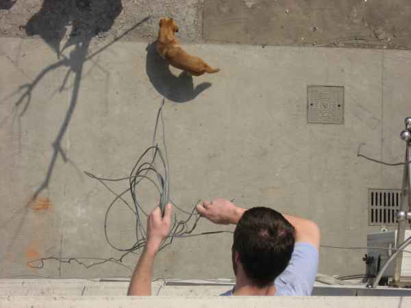 Pošto je Julia otišla, a Rakel i Alfonso će svratiti samo po svoje stvari, vreme je bilo da Imael i ja uvedemo internet na gajbu. Neki Brazilac Leonardo (ili tako nešto) koji je za stalno zaposlen ovde (ali duže vreme radi u kancelariji Huaxina u Brazilu) ima na gajbi kablovski ili sl. intenet. Onda je jedan kabl izvučen iz njegovog stana i nakačen na ruter (tako delimo jednu vezu ka internetu na više ljudi), a odatle idu kablovi do svakog od naših stanova. Sve je to lepo da Leonardo ne živi na drugom spratu a Ismael i ja na šestom, pa još treba dovući i kablove do drugih stanova. Pošto je tako lakše, kablovi se razvlače spolja. Primenjuju se metodi "ti baci a ja hvatam" i "ljuljaj daleko dok ne preskoči onaj %!#$! erkondišn". Evo kako to ide...