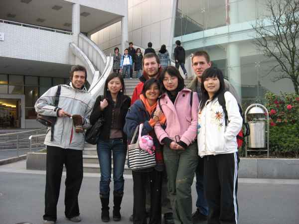 Nije baš bilo lako probuditi se sutra. Ovo je bila već druga nedelja kako odlazimo na Zhe Jiang univerzitet i tamo imamo neke "časove" Kineskog sa nekim studentkinjama koje Marek i Katia poznaju. Pre prvog puta, ozbiljno su nas ispreskakale nekim pitanjima "koliko ozbiljno hoćete da učite? Koliko reči znate? Da li umete da čitate Pin Yin (kineske reči napisane latinicom sa označenim tonovima na samoglasnicima)?" Katia i Marek već duže vreme vežbaju sa jednom devojkom, pa smo Ismael i ja dobili svoje "učiteljice". Iako su devojke nastupile ozbiljno, časovi su se posle nekog vremena razlabavili i pretvorili u neku neobaveznu priču sa povremenim epizodama na Kineskom. Ipak, one imaju veliku želju da nam pomognu i dale su nam slobodu da organizujemo sadržaj naših časova kako god nama odgovara. Tako smo prošle nedelje kupili dva udžbenika i sada ćemo da idemo po tim lekcijama. Jedino sam se ispalio što nisam video da uz udžbenik ide i MP3 cd. Sve bi bilo ok da nisam bacio račun čim sam izašao iz knjižare (hm... odakle ta navika?). Ali sam se setio! Sada na časove nosim moj MP3 fleš, pa onda zamolim devojke da pročitaju dijalog, da bih ja kući mogao da vežbam izgovor. Evo nas sa našim profesoricama...