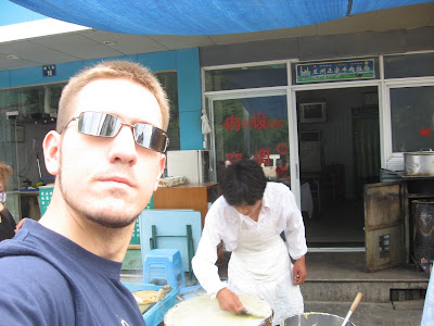 This morning was quite usual. Yesterday night I've got few greetings, one even one hour before my birthday, because my friend didn't count for daylight saving time in Europe. I must say that I didn't announce to people here that today is my birthday (except to few of my closest friends) because I don't want people to feel obligate to give me some presents or something. I packed my laptop like every day, took a shower and went to work. Past few days I don't try so hard to be there before 8:15. i think this is Shubham's fault, because of his "flexible" style and time of coming to work. Without a hurry, I stop to by "Chinese pancakes" (I think Xiao Bin told me once the name of this food, but I've forgot). I used this opportunity to record a video of the guy making this so simple, yet so tasty food! And just 2 yuans!