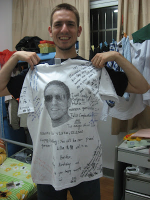 After taking photos with everybody, people showed me my present... t-shirt with signatures and messages from everybody. Even Ismael and Marek send something by e-mail and it was printed on the shirt! Incredible... and on the face of the shirt it was my portrait with message "asta la vista China!"... the best present I could get for my trip home.