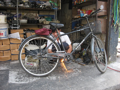 After talking to Lao Zhang and Lou Jin, I calm down a little bit and get copies of appartment keys from the 3rd floor of the company, and I plan to cut my bike lock in bike repair shop, and to get new lock for replacement. Ok... it's not so bad. I just hope that no one will jump into my appartment for two more days wile I'm here. Lou Jin is asking some silly questions about my keys and I find it hard to explain to her which keys I have lost and which copies I took from the company... hm... that is not exactly a nobel prize winner thinking, she should understand this from just one sentence! Later, I found out that she had a reason to be confused about the keys, he he he